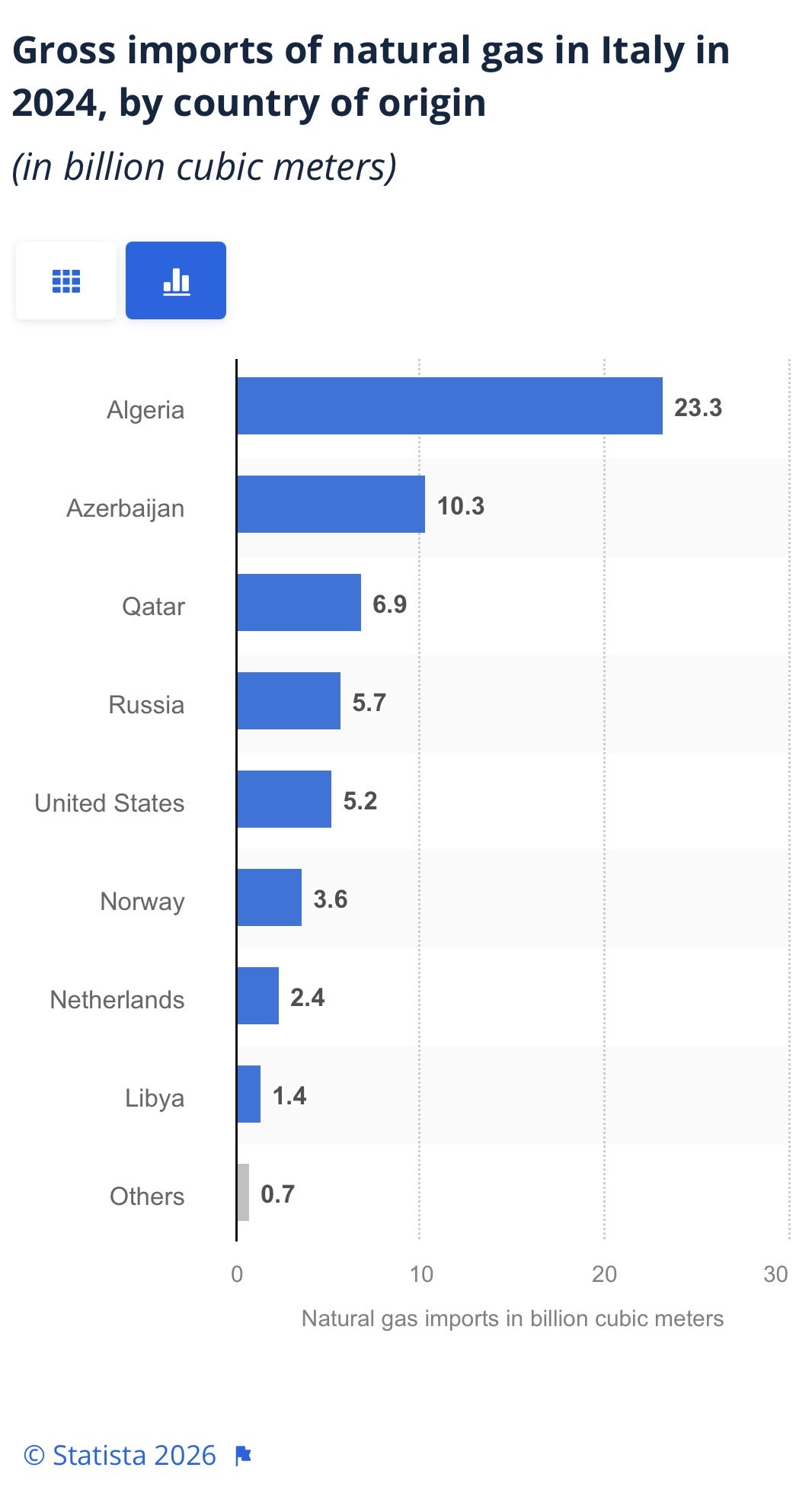 Abbiamo visto sopra quasi siano le nostre fonti del gas e i rischi annessi a forniture di Paesi esposti all’estremismo e alle guerre (Algeria, Qatar, Libia, Azerbaijan) o disposti a esercitare coercizione politica (Russia, Stati Uniti sotto Trump). Del petrolio invece i principali fornitori in anni recenti sono stati Libia, Azerbaijan, un alleato della Russia come il Kazakhstan, l’Iraq e l’Arabia Saudita.