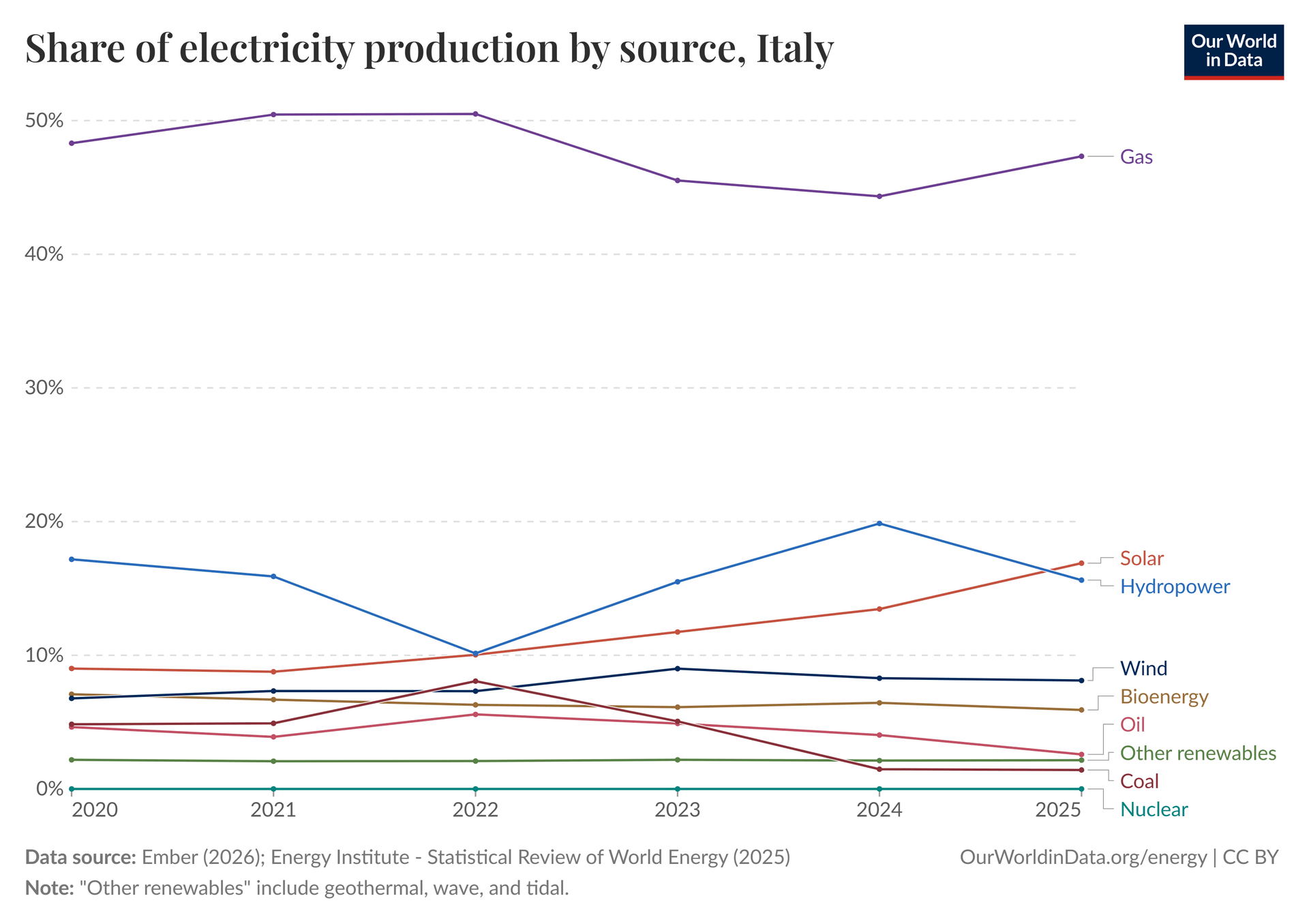 Non siamo in una condizione confortevole. Né possiamo illuderci che problemi del genere si risolvano in pochi mesi, ma dobbiamo riconoscerli più e meglio di come si sia fatto finora. Il grafico sotto mostra per esempio che, per la prima volta dall’aggressione russa all’Ucraina, con i cali del prezzo nel 2025 è tornata ad aumentare sia la quantità (da 118,5 a 125 terawattora) che la quota di energia elettrica (dal 44,3% al 47,3% del totale) prodotta da metano.