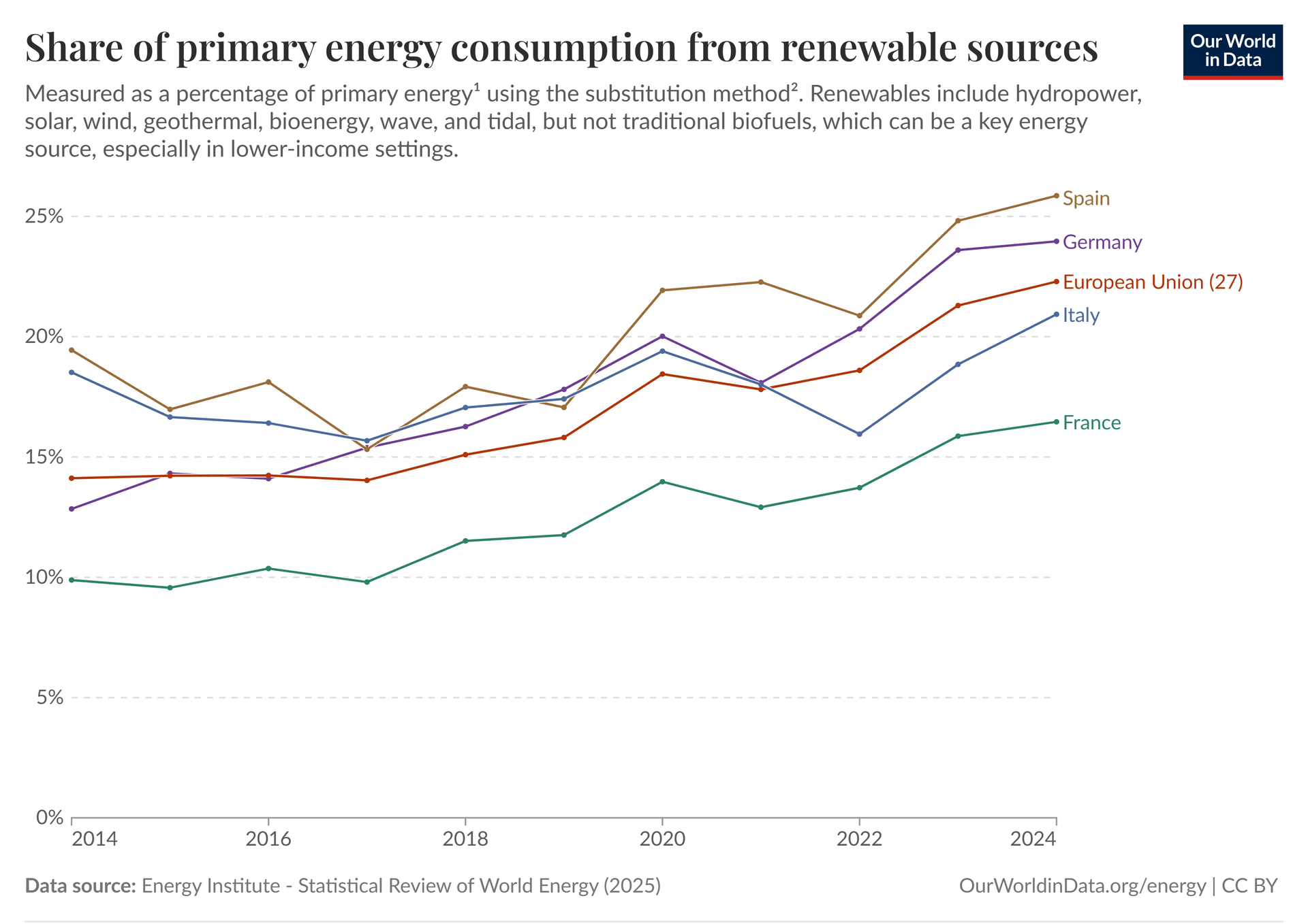 E malgrado gli enormi incentivi, costosi e malgrado i progressi, anche recenti, nell’ultimo decennio la quota delle rinnovabili nel consumo di energia in Italia è cresciuta meno che in Spagna, in Germania e nella media europea (mentre la Francia si affida al nucleare civile). Vedi sotto.