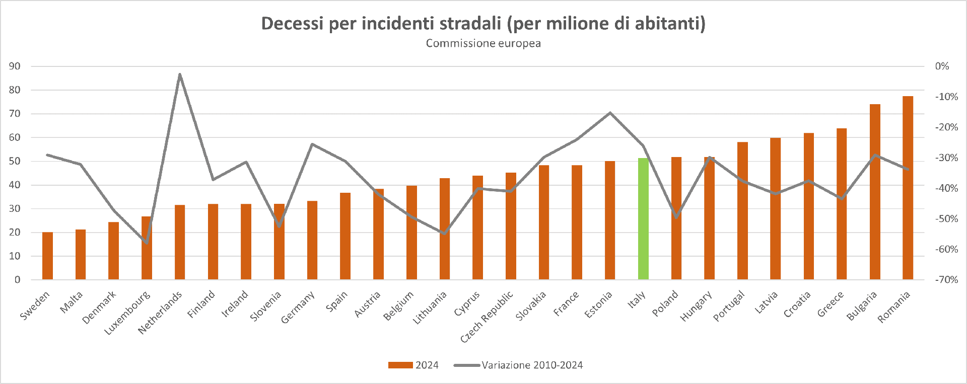 Ma c’è qualcos’altro da sapere, quanto a questo: mentre nel contrasto agli assassinii progrediamo più degli altri e siamo più avanti, nella sicurezza stradale sta accadendo l’opposto. I progressi dell’Italia sono più lenti di quelli di gran parte degli altri Paesi europei e registriamo una frequenza di incidenti mortali decisamente sopra le medie.
